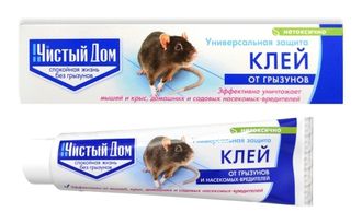 Клей Чистый дом от грызунов и насекомых представляет собой клейкое вещество, которое долго не застывает при контакте с кислородом. Клей наносят на специальную поверхность, которая хорошо фиксируется на полу, чтобы грызун не утащил ее с собой, оказавшись в западне. В этих целях используют кусок плотной ткани, картон, лист фанеры.